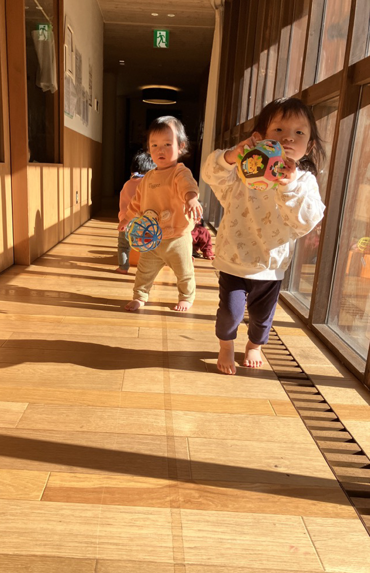 また、自然に恵まれた環境の中、お散歩も積極的に取り入れています。様々な刺激を受けながら心も体も成長できるようにしていきたいです。